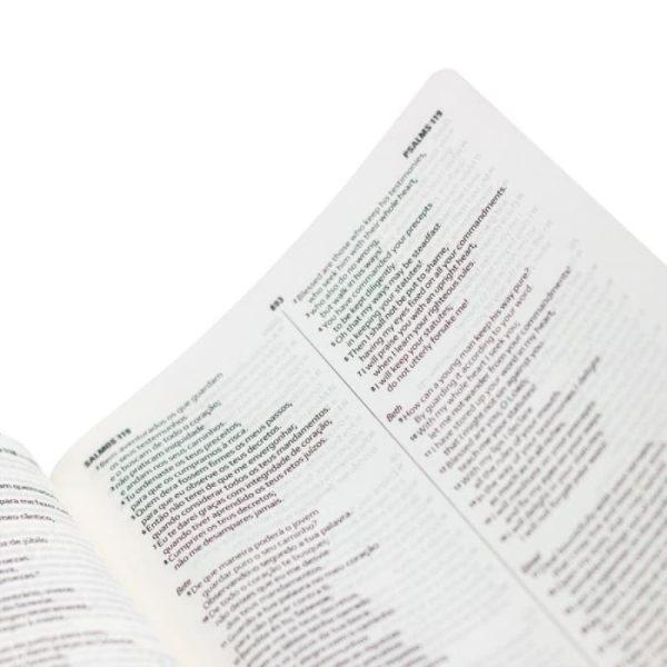 Esta edição da Bíblia Sagrada oferece o texto bíblico em duas línguas: inglês e português. Na publicação, as traduções Nova Almeida Atualizada (NAA) e English Standard Version (ESV), foram dispostas em duas colunas, permitindo que o leitor compare lado a lado o texto bíblico nas duas línguas. A English Standard Version (ESV) é uma das mais consagradas traduções da língua inglesa, tendo como base a tradicional King James Version (KJV). De maneira muito similar ao que foi feito com a Almeida Revista e Atualizada (ARA) e que resultou na Nova Almeida Atualizada (NAA), o texto da KJV foi trabalhado meticulosamente, à luz das línguas originais, por especialistas. O resultado é uma tradução bíblica literal, que ainda conserva o padrão clássico da KJV, mas com um vocabulário mais acessível ao leitor de hoje. A ESV é uma das traduções bíblicas mais populares nos Estados Unidos e em todo o mundo de fala inglesa.