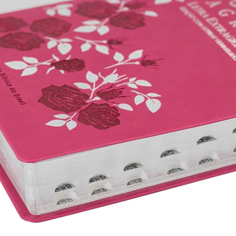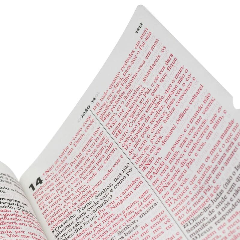 Com tamanho de letra extragigante e palavras de Jesus impressas em vermelho, este modelo da Bíblia Sagrada oferece mais conforto na leitura, especialmente ao grupo da terceira idade ou àquelas pessoas com problemas leves de visão.