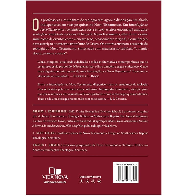 Os professores e estudantes de teologia têm agora à disposição um aliado indispensável em suas pesquisas no Novo Testamento. Em Introdução ao Novo Testamento: a manjedoura, a cruz e a coroa, o leitor encontrará uma apresentação completa de todos os 27 livros do Novo Testamento, além de um exame minucioso de eventos como a encarnação, o nascimento virginal, a crucificação, a ressurreição e o retorno triunfante de Cristo. Os autores ensinam a essência da teologia do Novo Testamento, sintetizada com maestria no subtítulo “a manjedoura, a cruz e a coroa”.