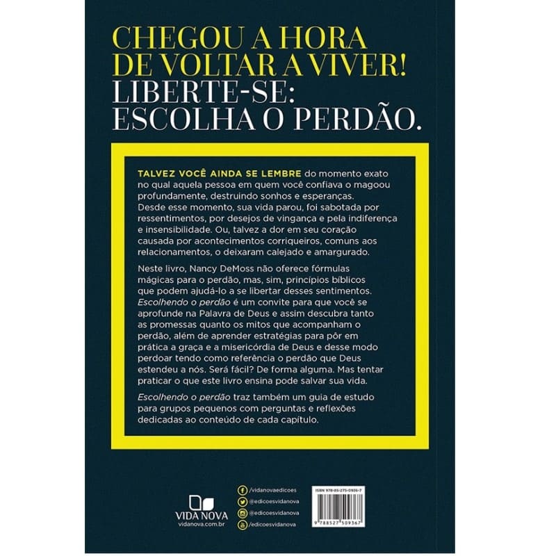Nesse livro, Nancy DeMoss não oferece fórmulas mágicas para o perdão, mas, sim, princípios bíblicos que podem ajudá-lo a se libertar de ressentimentos, desejos de vingança e amargura. Escolhendo o perdão é um convite para que você se aprofunde na Palavra de Deus e assim descubra tanto as promessas quanto os mitos que acompanham o perdão, além de aprender estratégias para pôr em prática a graça e a misericórdia de Deus e desse modo perdoar tendo como referência o perdão que Deus estendeu a nós. Será fácil? De forma alguma. Mas tentar praticar o que este livro ensina pode salvar sua vida.