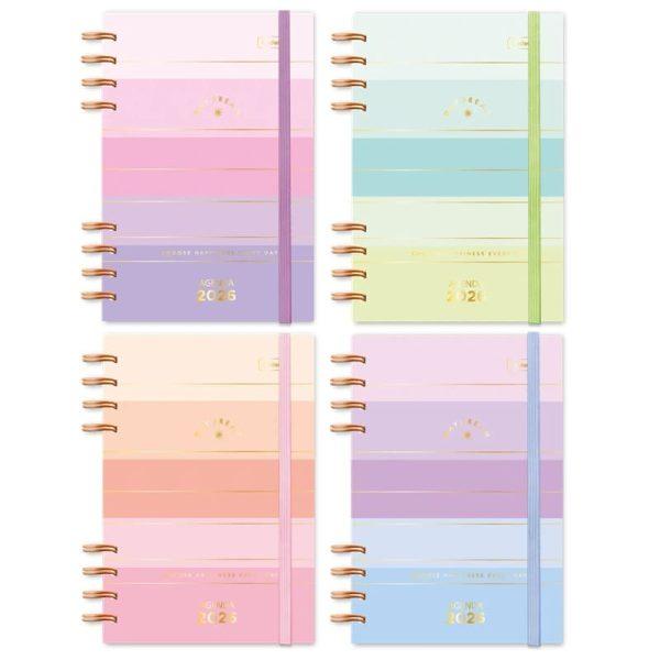 Bolsa portfólio, cartela de adesivos, metas anuais, planejamento anual, planejamento mensal, diário com 1 dia por página e wire-o dourado.