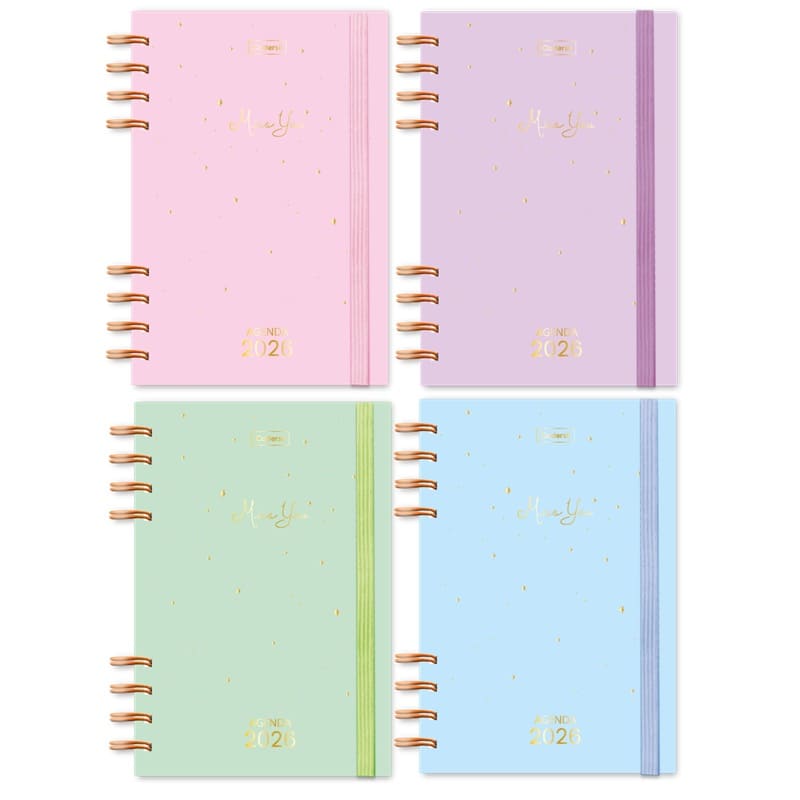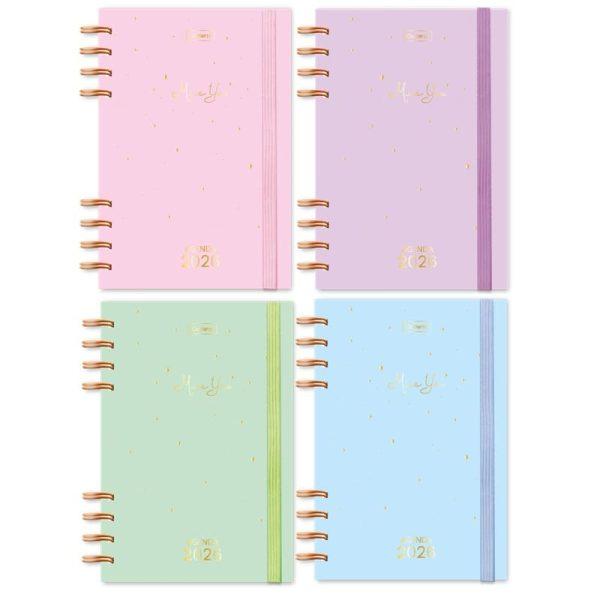 Bolsa portfólio, cartela de adesivos, metas anuais, planejamento anual, planejamento mensal, diário com 1 dia por página e wire-o dourado.