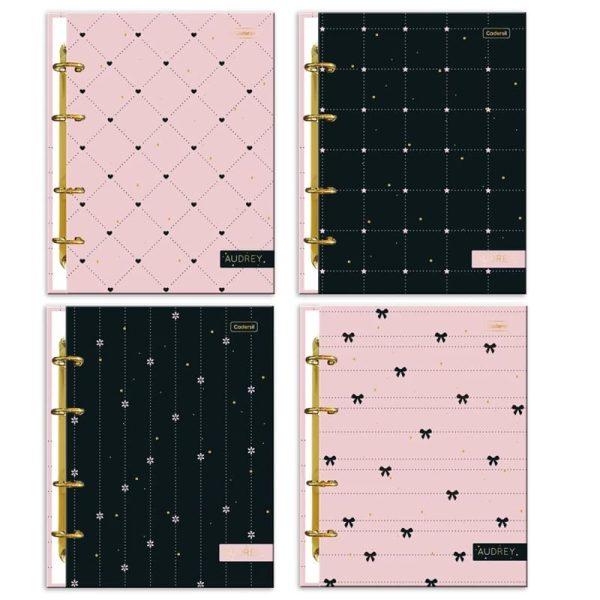 Bolsa portfólio, cartela de adesivos, folhas brancas com pautas pretas, 6 divisórias pastel e argolas douradas.