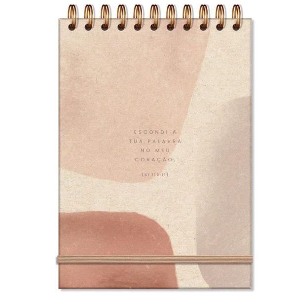 Capa dura, miolo liso, formato 14,5 cm x 20,5 cm, 80 folhas em papel offset 120g/m2 (a caneta não passa para o outro lado), encadernação wire-o e elástico para fechamento.