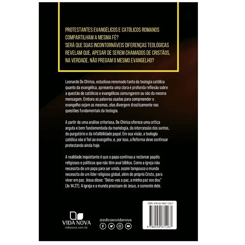 Leonardo De Chirico, estudioso renomado tanto da teologia católica quanto da evangélica, apresenta uma clara e profunda reflexão sobre a questão de católicos e evangélicos comungarem ou não da mesma mensagem. Embora as palavras usadas para compreender o evangelho sejam as mesmas, elas divergem drasticamente nas questões fundamentais da teologia.
